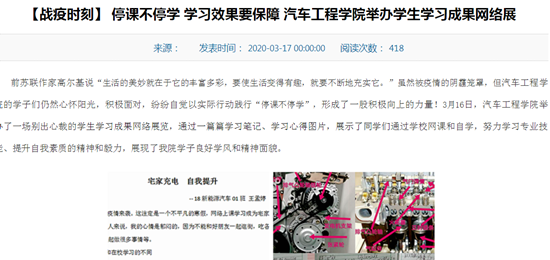 学校新闻网对发动机构造与拆装等课程在线教学改革及实施情况进行了报道,如下图所示。