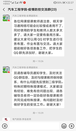 2月10日,汽车工程学院发布了“关于做好因新型冠状病毒肺炎疫情延期开学期间有关教育教学工作的建议”,副院长彭勇制定了学院教学工作应急方案,明确了利用现有资源,采用超星学习通、QQ直播、腾讯课堂等线上平台,让学生在家通过手机、电脑进行线上学习,完成老师布置的学习任务。